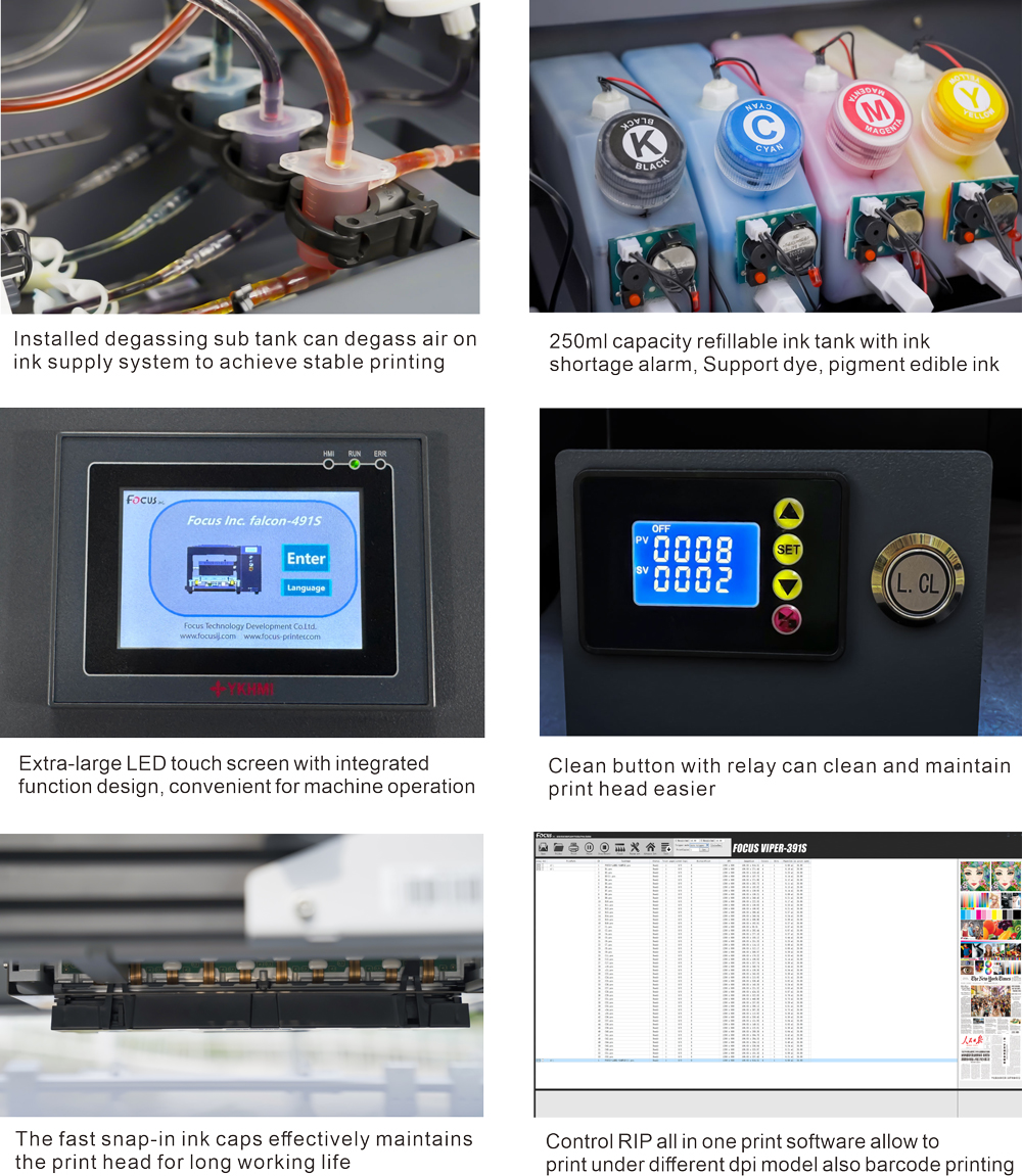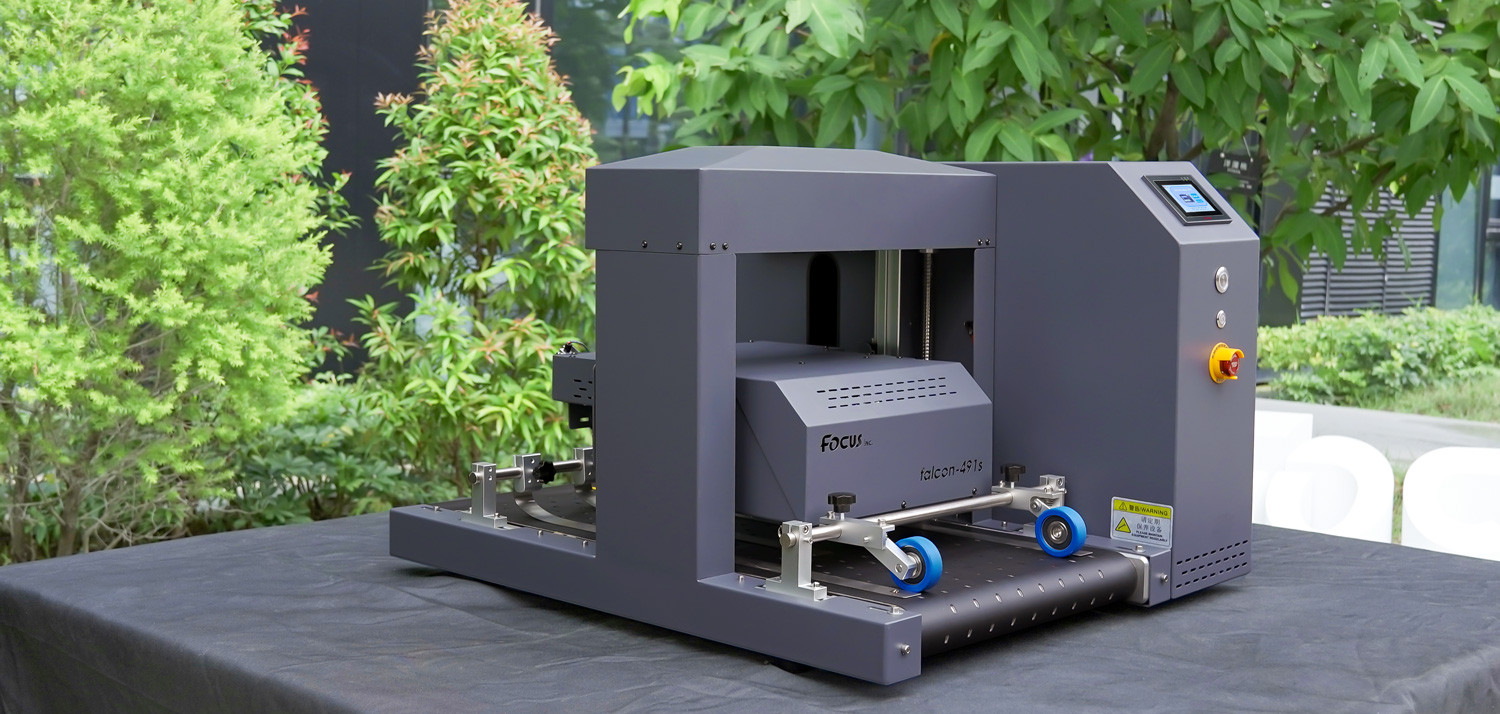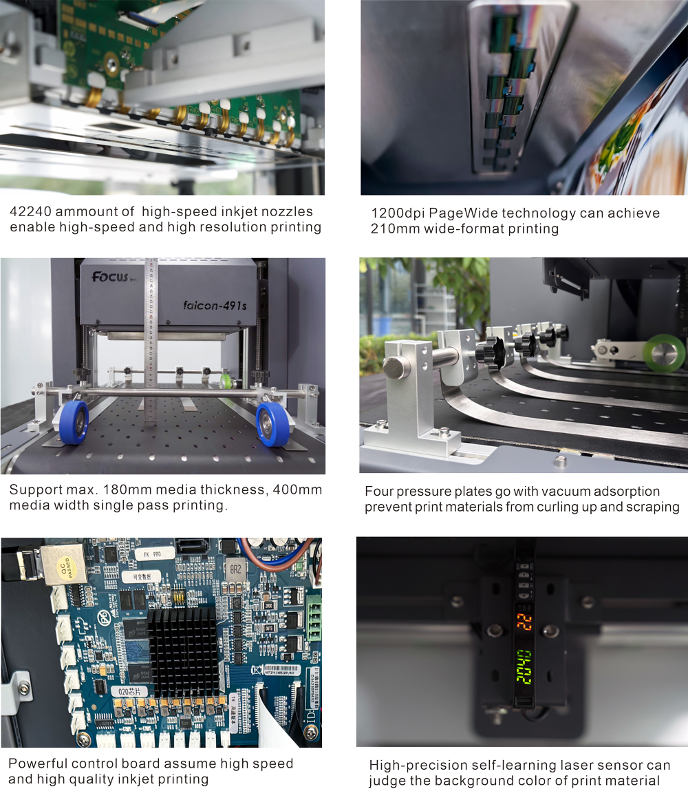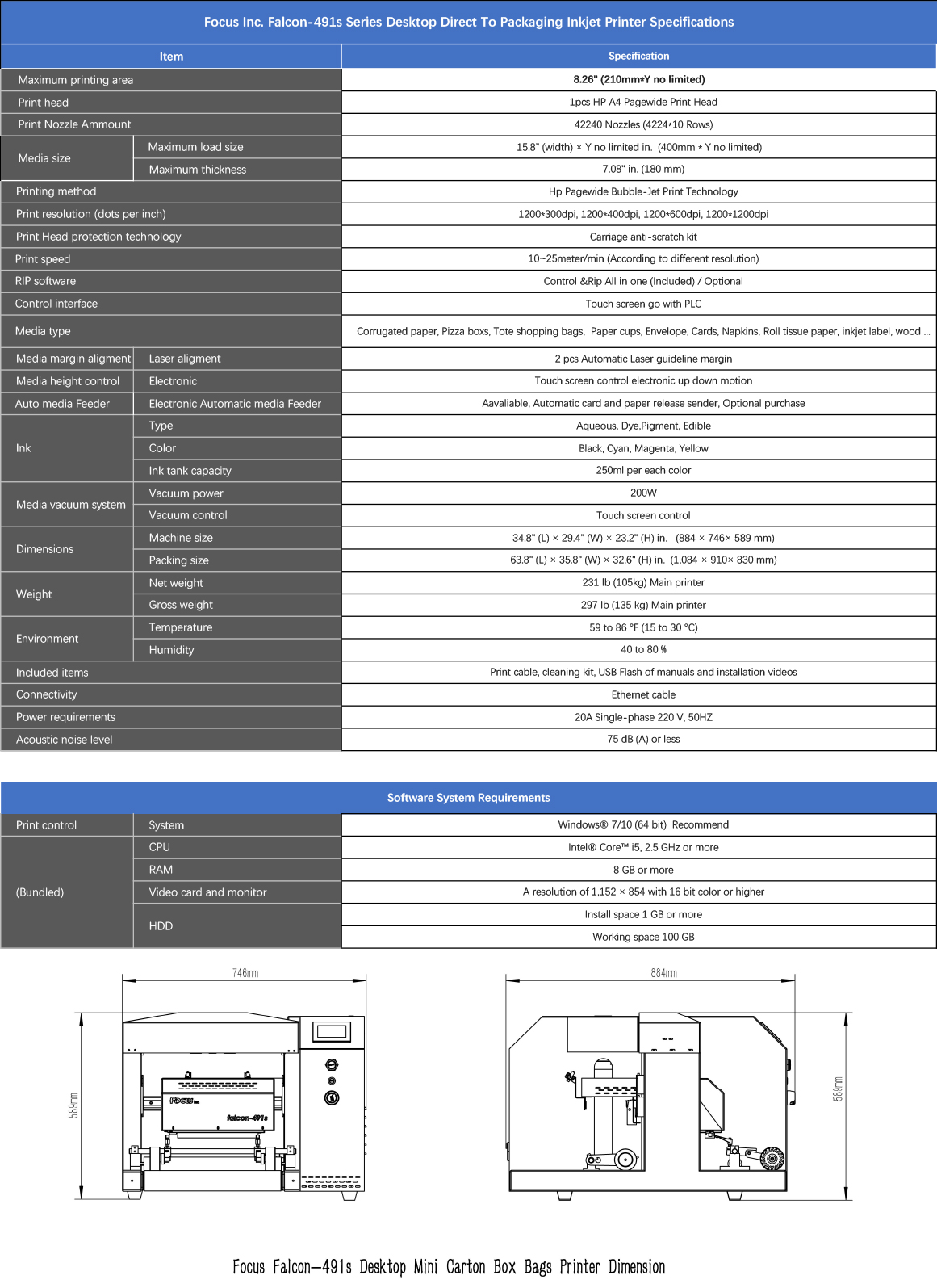Focus inc. Falcon-491s was special designed for small order Print-On-Demand customers who have small but high frequency orders but with small budget. it is small desktop size design but also widely used for paper bags, paper box, corrugated cardboard printing...